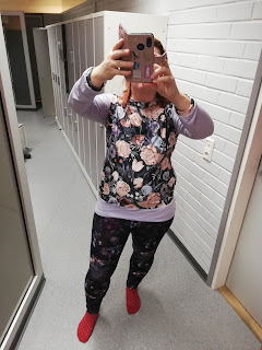 Työkaverille neuloin säärystimet. Nämä valmistui tämän päivän puolella 14.2. Silmukoita 55, langat 7 veljestä ja my home lankaa.
